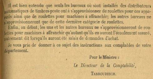 « Afin d'éviter toute confusion avec des roulettesd'un type spécial et provisoire réservé à des distributeurs fonctionnant déjà dans certains bureaux, les commandes n° 611, les relevés n° 615 et les états collectifs n° 615 bis indiqueront distinctement s'il s'agit de roulettes pour distributeurs automatiques ou de roulettes pour machines à affranchir (Ex.: Distrib. — Mach. à aff.). »